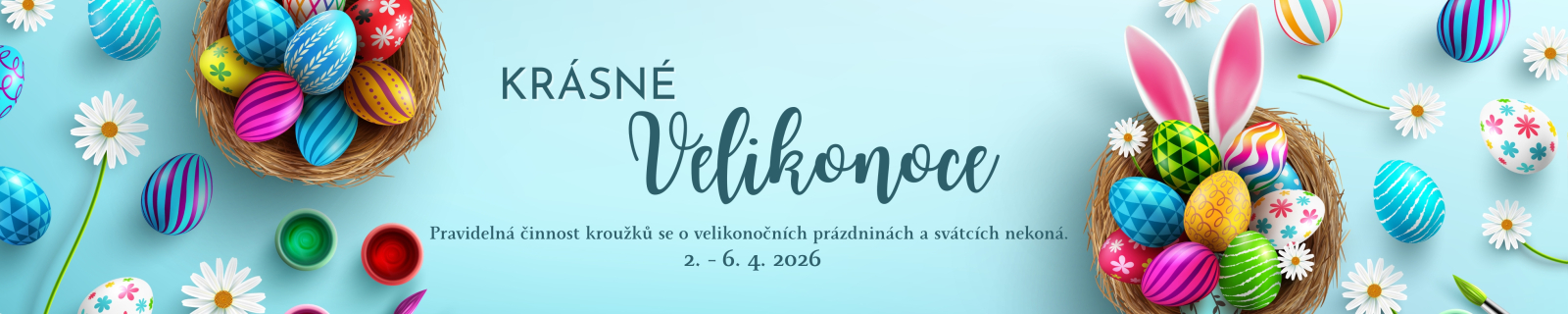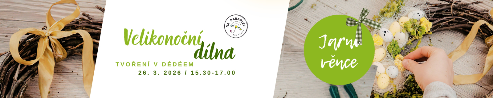Tvořivá dílna pro děti od 3 - 15 let (3-6 let s rodiči). Přijďte si vyrobit velikonoční věnce. Přihlaste se přes naše www stránky (klientské centrum). Pokud nejste naším klientem a máte o akci zájem, přihlaste se podle návodu v záložce dokumenty (PODROBNÝ NÁVOD K REGISTRACI DO KLIENSTKÉHO CENTRA). Těšíme se na velikonoční čas a tvoření s Vámi.