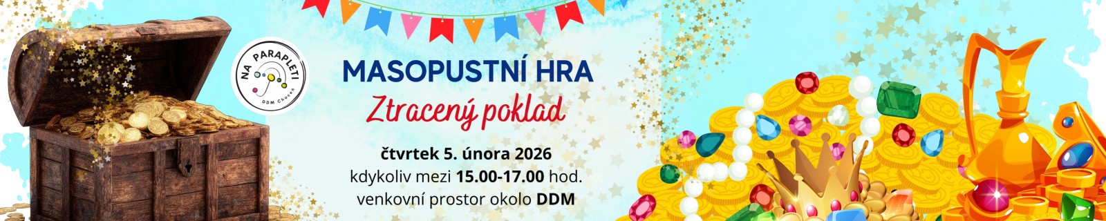 Venkovní masopustní hra "Ztracený poklad". Objevte kouzlo masopustu a zahrajte si veselou hru s prohlídkou tradičních masek po okolí DDM. Pravidla hry a hrací kartu potřebnou ke hře si vyzvedneš v hale DDM. Odměnu za vyplněnou kartičku si můžeš vyzvednout opět v hale. Plakát najdeš vedle v galerii :)