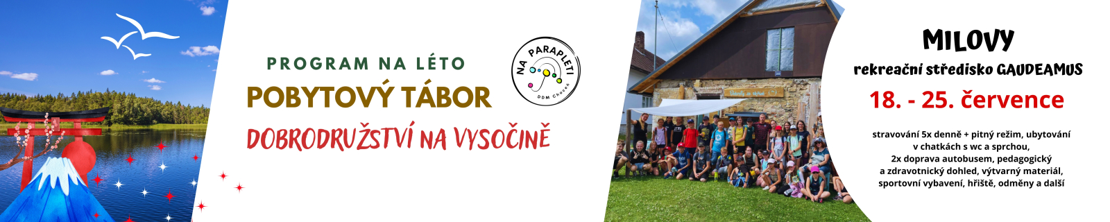 POBYTOVÝ LETNÍ TÁBOR 2026. DOBRODRUŽSTVÍ NA VYSOČINĚ. Vyraz s námi na prázdniny do rekreačního střediska Gaudeamus! Čeká nás ubytování v pohodlných chatkách s vlastním WC a sprchou. O skvělé zázemí i chutné stravování se postará hotel Gaudeamus. Celý areál je zasazený mezi stromy, uprostřed krásné přírody, kde je prostor na hry, smích i nová kamarádství. Hlavním tahákem tábora je celotáborová hra plná napětí, dobrodružství, týmových výzev a zábavných úkolů, na které děti jen tak nezapomenou. Okolí je turisticky velmi atraktivní – vyrazíme na výlety do okolí Milov, objevovat skalní útvary a užijeme si i Milovský rybník, kde nás čeká vodní zábava včetně paddleboardů! A hlavně – čeká nás spousta srandy, her, táboráků, výletů, koupání a večerních programů, protože tábor vedou pohodový vedoucí, kteří se postarají o skvělou atmosféru a bezpečí každého dítěte. Tak neváhej a pojeď!