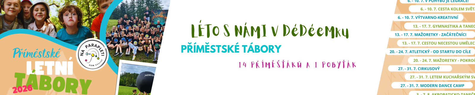 AKROBATICKO-TANEČNÍ PŘÍMĚSTSKÝ TÁBOR PRO DĚTI Zajímá tě, jaké to je být akrobatkou nebo akrobatem? Teď to můžeš zjistit! Přijď si vyzkoušet vzdušnou akrobacii na kruhu i na šále a objev svět, kde se spojuje síla, ladnost a odvaha. Během týdne děti čekají také gymnastické prvky na zemi, taneční sestavy, práce s hudbou i rozvoj pohybové kreativity. Vše probíhá bezpečně, hravou formou a pod vedením zkušených lektorů, přizpůsobené věku i schopnostem dětí. Nechybí hry, týmové aktivity, zábava a přátelská atmosféra, díky které si každý odnese nejen nové dovednosti, ale i skvělé zážitky.